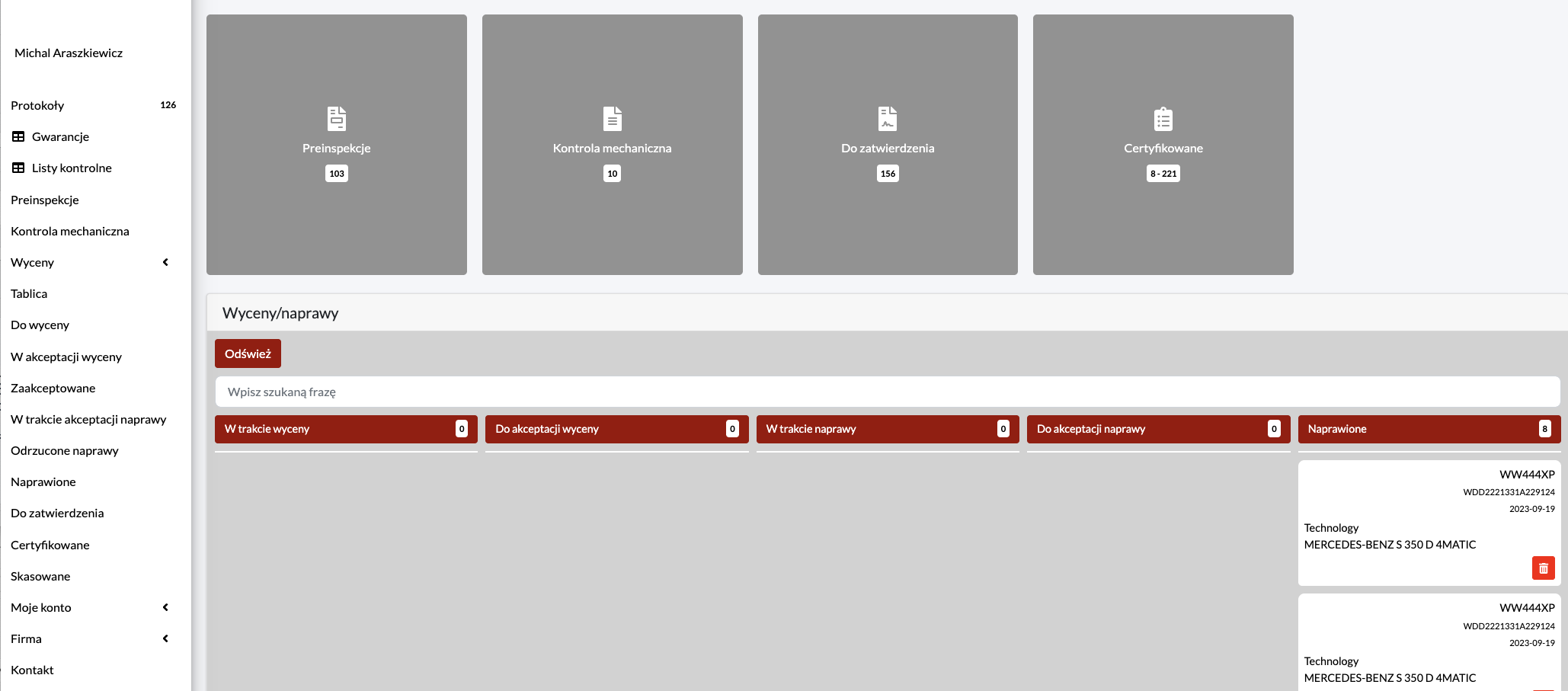 - Skasowane – archiwum pojazdów wycofanych z procesu